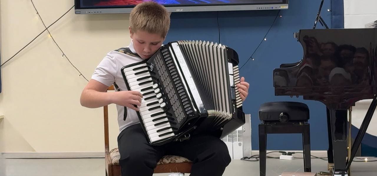 Описание: Новогодний концерт в музыкальной школе. Савелий исполняет на аккордеоне русскую народную песню «Во кузнице»